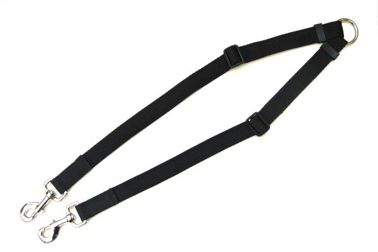 A lead splitter, sometimes called a coupler, is a short piece of equipment with one ring or clip at the top and two leads or clips at the bottom, allowing two dogs to be walked using a single lead.