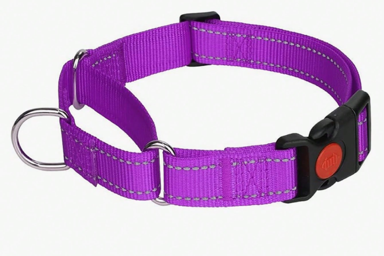 A martingale collar is designed to prevent dogs from slipping out of their collar while still avoiding the full tightening effect of a slip collar. It tightens slightly when tension is applied but stops at a preset limit, making it useful for dogs with narrow heads or those prone to backing out of collars.