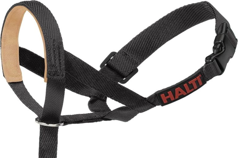 A Halti headcollar fits around a dog’s nose and behind the ears, giving the handler more control over the dog’s head and direction during walks. Because a dog’s body tends to follow where the head goes, it can help manage strong pulling or difficult handling during training.